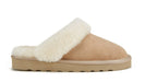 Luxe classic sheepskin mule slipper on a low platform sole. Soft shearling cuff and inner. Suede finish.