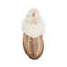 Luxe classic sheepskin mule slipper with shearling cuff and inner sole. Soft, metallic antique leather finish.