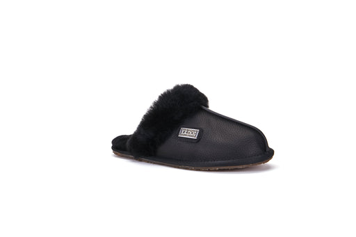 Luxe classic sheepskin mule slipper with shearling cuff and inner sole. Soft leather finish.