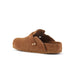 Clog style slip on sandal in soft suede with side buckle. Suede footbed and moulded sole for comfort.