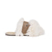 Muchas open toe mule slipper in super soft Luxe faux fur with vegetable dyed leather band. Faux fur inner half sole with suede footbed. PLEASE NOTE: The sizing on Muchas Slipper is reported as large by customers and we recommend sizing down one size.