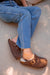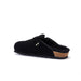 Clog style slip on shoe in soft suede with side buckle. Shearling footbed and moulded sole for comfort.